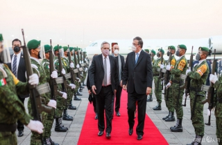 (阿根廷华人网2月22日讯/朱莉)受墨西哥总统安德烈斯·曼努埃尔·洛佩斯·奥夫拉多尔邀请,本周一上午10点,阿根廷总统阿尔贝托·费尔南德斯在第一夫人Fabiola Yañez的陪同下,抵达墨西哥城贝尼托·华雷斯国际机场,将出现独立200周年纪念活动。墨西哥外交部长马塞洛·埃布拉德(Marcelo Ebrard)和阿根廷驻墨西哥大使Carlos Tomada前往机场迎接。陪同费尔南德斯出访的人员包括外交、国际贸易和宗教事务部长费利佩·索拉、经济部长马丁·古斯曼、副内阁部长Cecilia Todesca等。