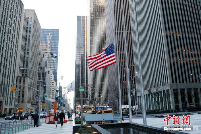 当地时间2021年2月24日,美国纽约曼哈顿街道上的美国国旗降下半旗。2月22日,美国总统拜登发布公告,下令美国境内外所有联邦建筑和军事设施降半旗,为期5天,以悼念新冠逝者。 中新社记者 廖攀 摄