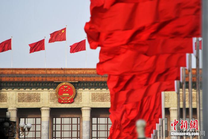 资料图:北京人民大会堂外红旗迎风飘扬。 金硕 摄