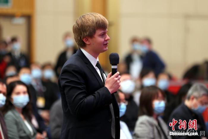 图为塔斯社记者在梅地亚中心多功能厅提问。 中新社记者 蒋启明 摄