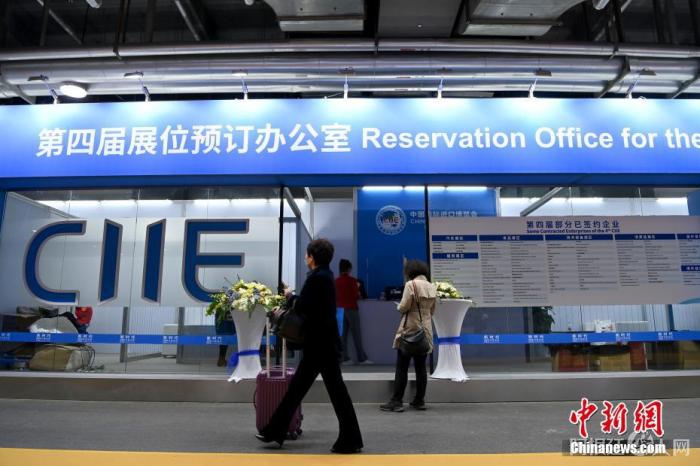 2020年11月9日,上海,第三届中国国际进口博览会的参会者经过第四届展位预订办公室。 中新社记者 侯宇 摄