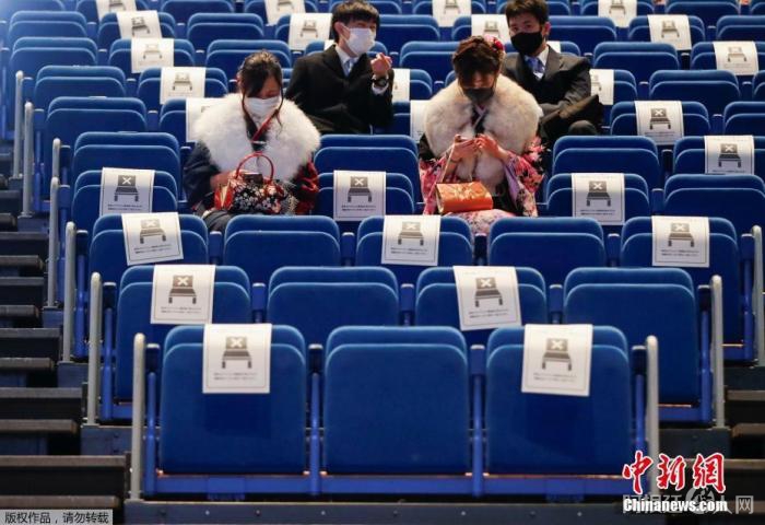 资料图:当地时间2021年1月11日,由于新冠疫情,日本首都圈正处于紧急状态,图为横滨,少男少女戴着口罩,盛装出席成人礼。