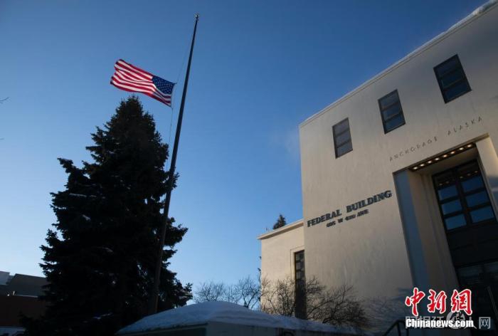 当地时间3月18日,美国阿拉斯加州安克雷奇市一处联邦建筑降半旗,以纪念亚特兰大枪击事件中的遇难者。此次枪击事件造成8人死亡,其中6人为亚裔女性。 中新社记者 刘关关 摄