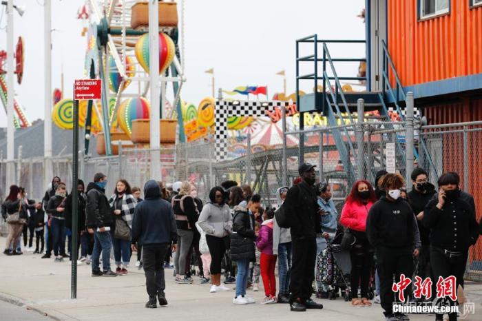 当地时间4月9日,美国纽约康尼岛游乐园重新开放,民众排队入园。当日,具有上百年历史的康尼岛游乐园在因新冠疫情关闭一年后重新开放。中新社记者 廖攀 摄