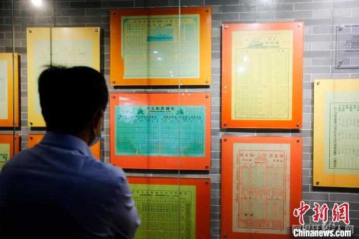 参观者正在阅览博物馆陈列的离乡移民时所乘游轮船期表。 王骏 摄