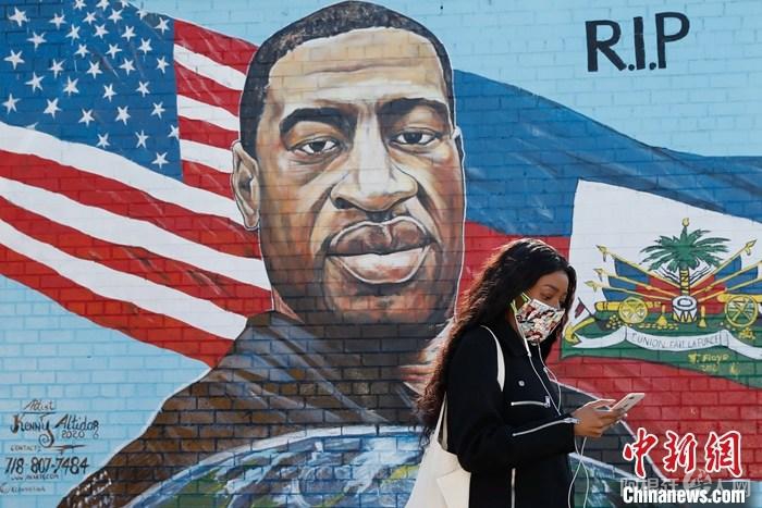 当地时间3月9日,美国纽约布鲁克林区一位市民走过弗洛伊德画像。当日,美国弗洛伊德命案“跪颈”执法前警察德里克·肖万的庭审在明尼苏达州亨内平县法院正式开始。 中新社记者 廖攀 摄