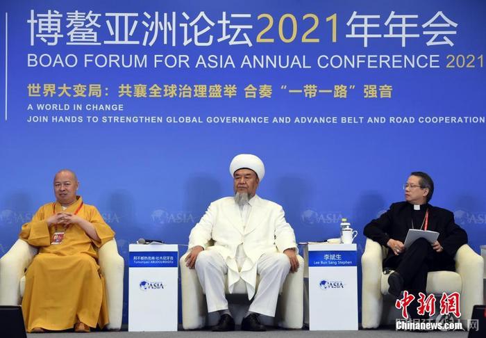 4月21日,博鳌亚洲论坛2021年年会“包容互鉴 协和万邦”宗教分论坛在海南省博鳌举行。图为中国佛教协会副会长、海南省佛教协会会长印顺大和尚(左),中国伊斯兰教协会副会长、新疆伊斯兰教经学院院长阿不都热克甫·吐木尼牙孜(中),天主教澳门教区李斌生主教(右)出席并参与讨论。 中新社记者 侯宇 摄