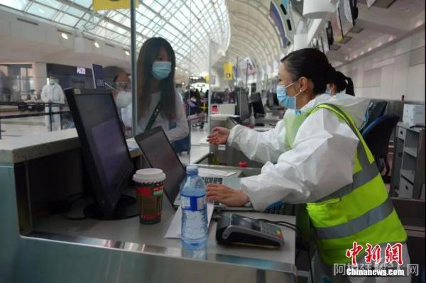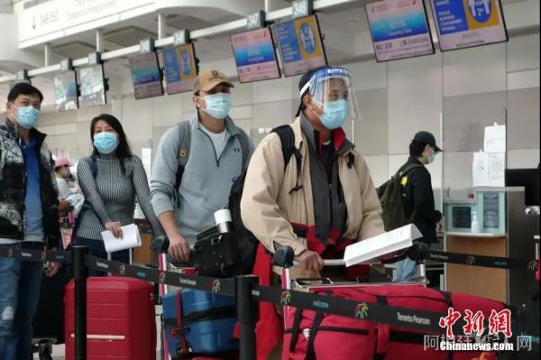 资料图:准备直飞上海的乘客在多伦多皮尔逊国际机场排队办理值机手续。 中新社记者 余瑞冬 摄