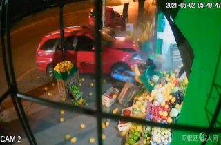 根据监控录像显示,事发时间5月2日凌晨5点多,一名21岁的女子正在水果店前的人行道上等公交车,不料一辆红色汽车失控冲向人行道,女子来不及躲闪,被汽车快速撞向水果摊。汽车前部因撞击而受损严重。