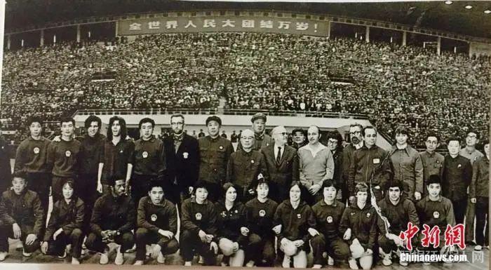 图为1971年美国乒乓球队与中方人员合照。(资料图片) 中新社发