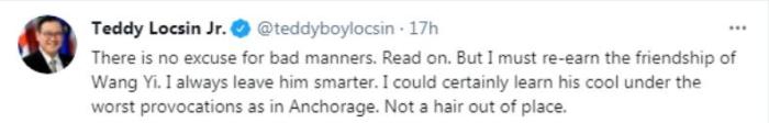 更让人啼笑皆非的是,他在之后的推文中一再提到王毅,称“我要学习他在安克雷奇(中美会谈)最恶劣挑衅下的冷静,没有一丝瑕疵。”