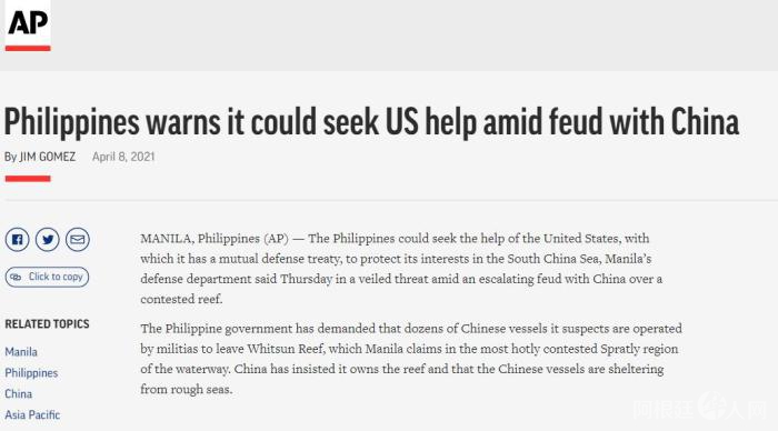 4月8日,菲国防部发言人安多隆更是扬言要寻求美国帮助,双方将在《共同防御条约》义务下,保护菲在南海的利益。