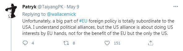 在华莱士的贴文下文,有评论写道“不幸的是,欧盟外交政策的很大一部分完全服从于美国。我理解政治联盟,但美国联盟是让欧盟帮美国的忙,不是为了欧盟,而是为了美国。”