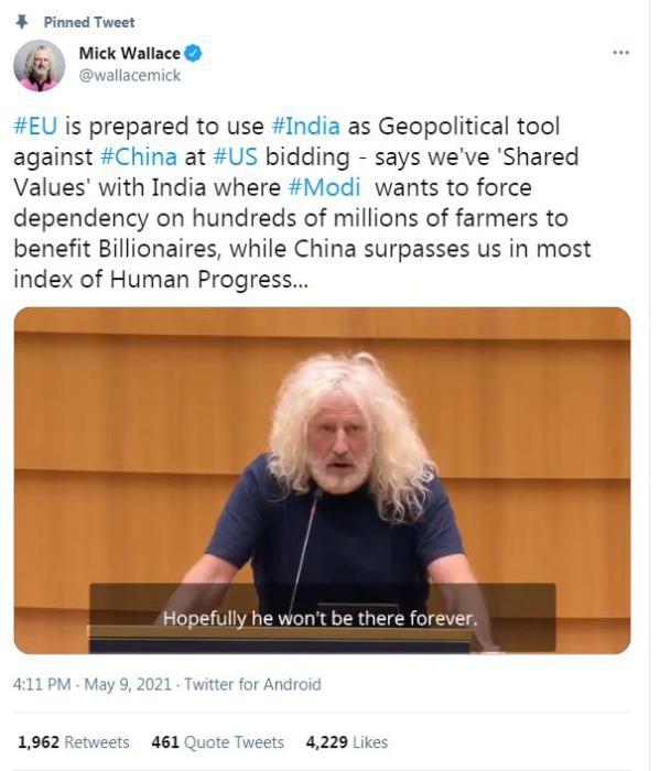 中新网5月11日电 当地时间9日,欧洲议会议员米克·华莱士(Mick Wallace)在其个人社交媒体上发布一段视频并置顶。他呼吁欧盟应与印度建立正常健康的关系,不要将其作为遏制中国崛起的工具。他还强调,中国在大部分“人类进步指标”上都超越了欧洲。