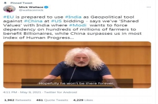 华莱士在帖文中写道,“在美国的要求下,欧盟准备利用印度作为针对中国的地缘政治工具,我们与印度有‘共同价值观’。印度总理莫迪想要迫使数亿农民成为附庸,从而让亿万富翁获利,而中国在大部分“人类进步指标”上都超越了我们……”