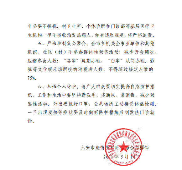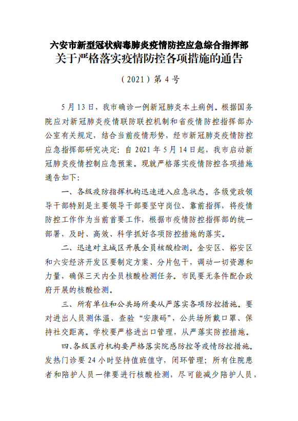 六安市疫情防控应急综合指挥部通告