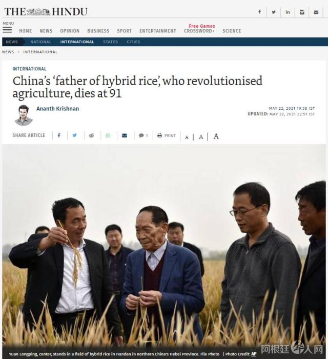 《印度报》在报道中提到,袁隆平“新的杂交水稻技术不仅造福于中国,而且也被其他国家积极采用。”