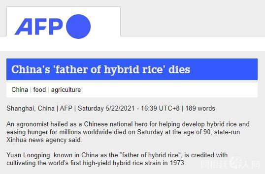 法新社称,因帮助开发杂交水稻和缓解全球数百万人的饥饿,而被誉为“中国民族英雄”的农学家袁隆平,于5月22日去世。