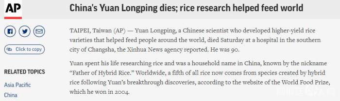 美联社在报道中称提到,袁隆平的团队与全球数十个国家和地区合作,致力于解决粮食安全以及营养不良的问题。“他的水稻研究帮助养活了世界”。