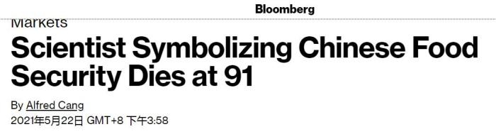 彭博社报道称,象征中国粮食安全的科学家袁隆平逝世,享年91岁。他在2019年被授予中国国家最高荣誉“共和国勋章”。袁隆平的研究“把无数人从饥饿中拉了出来”。