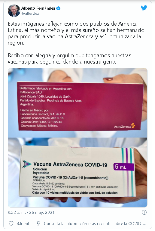 费尔南德斯在推文中写道:“这几张图片反映了拉丁美洲最北以及最南两个国家人民是如何联手生产疫苗从而向拉美人民提供病新冠疫苗的成果。我很高兴也很自豪,我们能够拥有我们自己制造的疫苗来帮助我们的人民。”