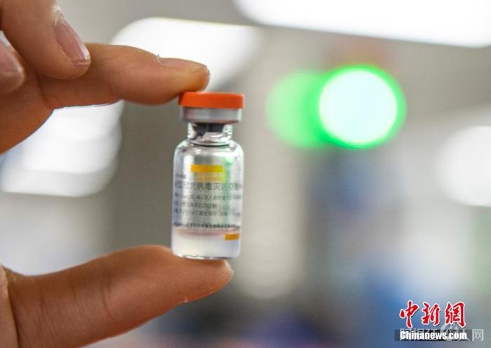 资料图:2021年1月6日,位于北京市大兴区的北京科兴中维生物技术有限公司的仓库内,工作人员展示一支西林瓶装新冠灭活疫苗。中新社记者 侯宇 摄