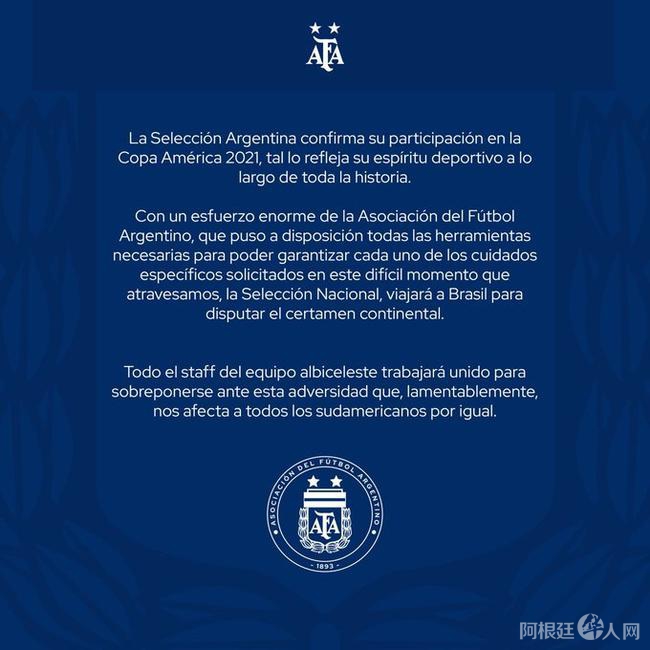 在其它几个国家队中,智利和厄瓜多尔还没有给出明确态度,玻利维亚在上周三就表示将会参加美洲杯。梅西对此事仍然保持沉默,但阿根廷官方已经发布声明将会参赛。“阿根廷国家队确认将会参加2021年美洲杯,在这个艰难时期,我们会竭尽全力保证各个环节。”阿根廷足协在官方声明中说道,“阿根廷足协将会竭尽全力,所有工作人员也都会全力以赴,去克服种种困难。”