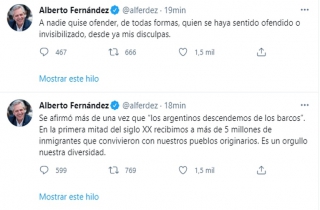 面对争议性言论,费尔南德斯随后通过自己的推特账号表示:“无论如何,我无意冒犯任何人,在此表达我的歉意。”他同时补充说,“阿根廷是从船上下来的说法早已有之。在20世纪上半叶,我们接收了超过500万的移民同我们的原著居民生活在一起。我们的(民族)多样性令人自豪。”