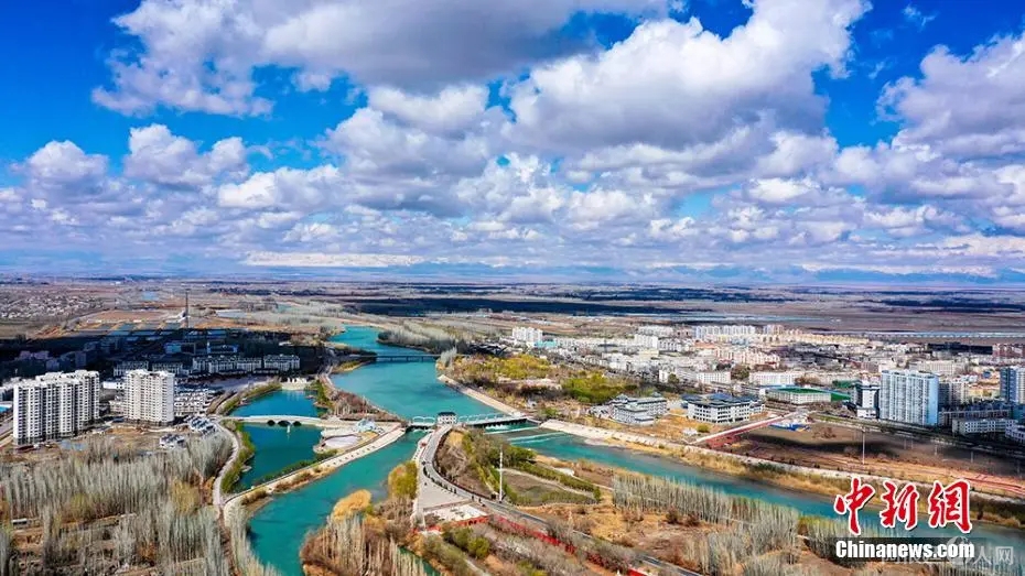 资料图:航拍春雨后的新疆博湖县城,蓝天、白云、碧水与河边芦苇交相辉映。年磊 摄