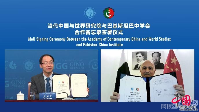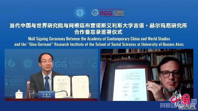 今日,中国外文局当代中国与世界研究院与阿根廷布宜诺斯艾利斯大学吉诺·赫尔玛尼研究所、巴基斯坦巴中学会、法国桥智库举行在线签约仪式,成立三家“当代中国与世界”联合研究中心,并启动“当代中国与世界知识分享计划”。中国外文局副局长兼总编辑高岸明出席活动并致辞。
