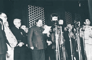 王明爱回忆说:“我们亲聆毛泽东主席向全世界宣告中华人民共和国中央人民政府成立了。接着是奏国歌、升国旗,激越的军乐声响彻云霄。我们都情不自禁高声唱起国歌,目送着五星红旗冉冉升起,心潮澎湃。”