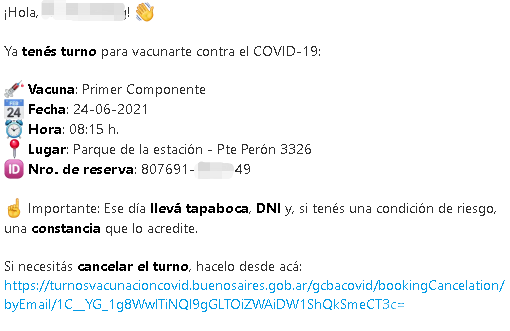 在选择接种中心以及接种时间后,您将会收到一条疫苗接种预约单,如上图所示。信息中会详细列出日期、时间、地点以及预约单号。图中被接种者所预约的地点是距离华人较多的Once区最近的“Parque de la estacion”接种中心,地址是Peron街3326号。