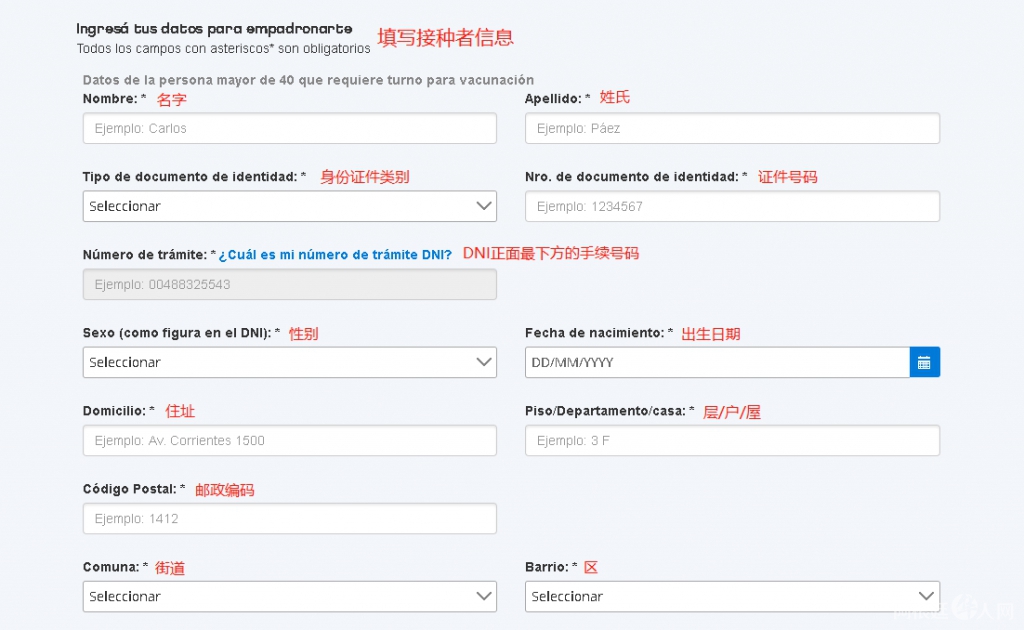 1- 在“Tipo de documento de identidad”处可使用阿根廷身份证(DNI)、中国因私护照(Pasaporte)以及居留白条(Residencia Precaria)等证件预约疫苗接种