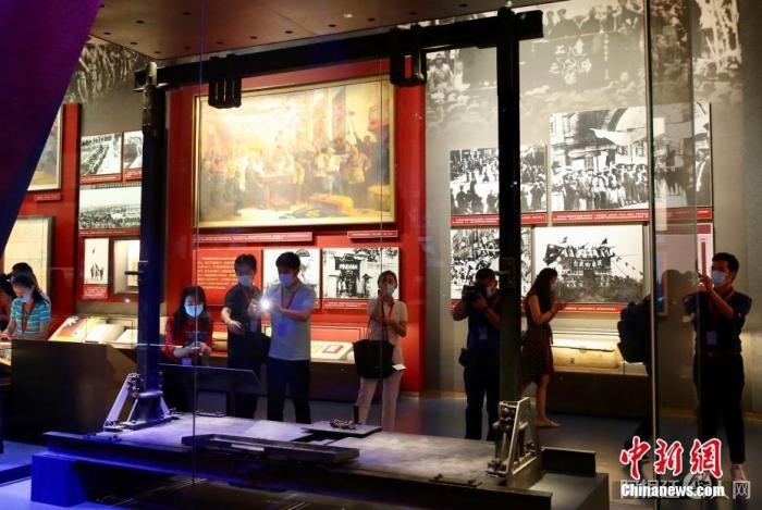 6月25日,中外媒体记者在北京参观中国共产党历史展览馆首展“‘不忘初心 牢记使命’中国共产党历史展览”。图为媒体记者正在拍摄编号为0001的中国共产党主要创始人之一李大钊就义的绞刑架。中新社记者 易海菲 摄