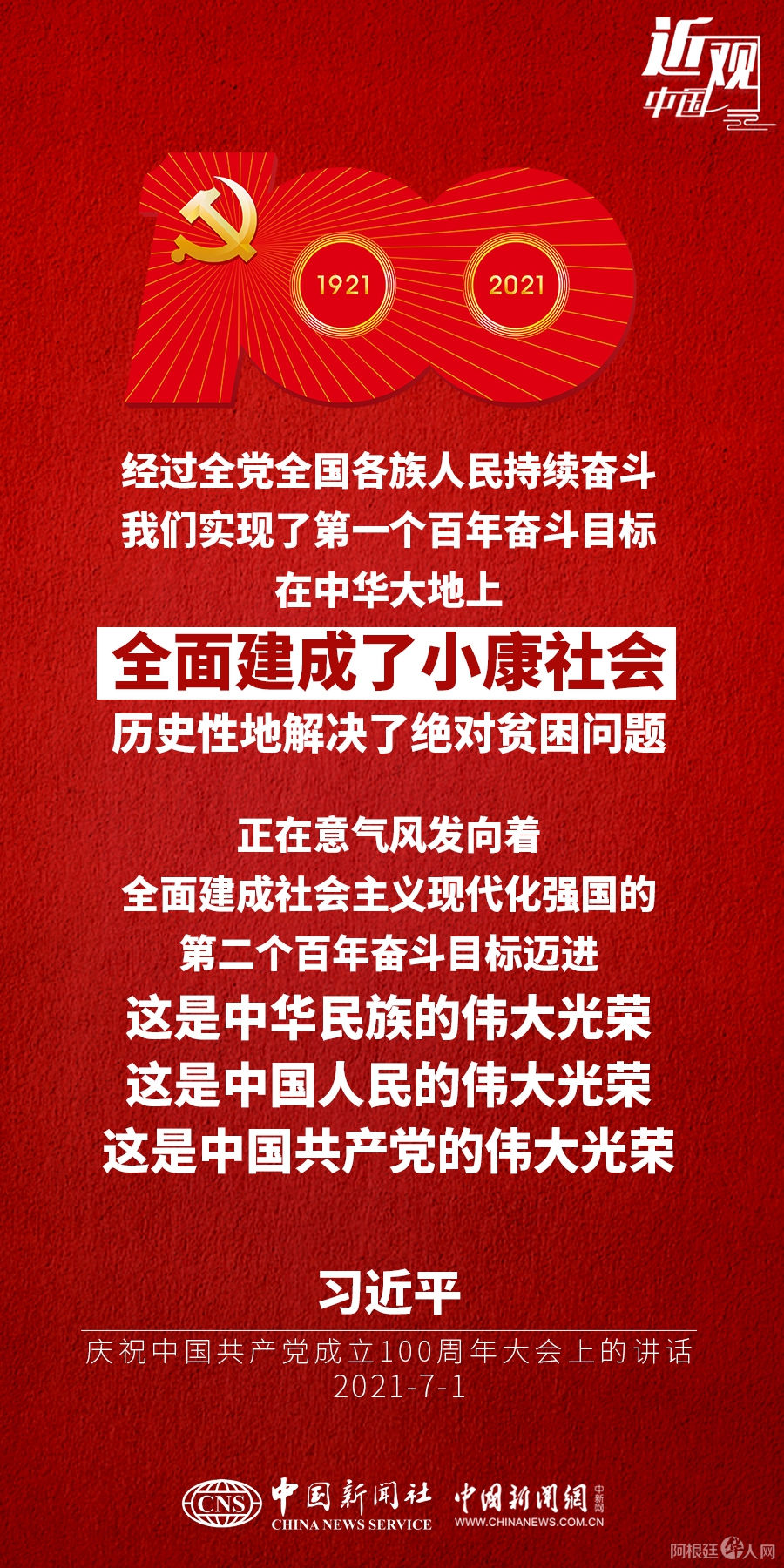 习近平说,在这里,我代表党和人民庄严宣告,经过全党全国各族人民持续奋斗,我们实现了第一个百年奋斗目标,在中华大地上全面建成了小康社会,历史性地解决了绝对贫困问题,正在意气风发向着全面建成社会主义现代化强国的第二个百年奋斗目标迈进。这是中华民族的伟大光荣。这是中国人民的伟大光荣。这是中国共产党的伟大光荣。