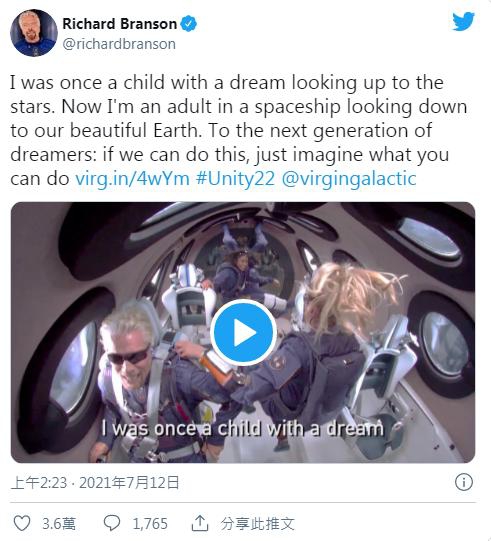 据报道,布兰森搭乘的维珍太空船“团结”号(VSS Unity)降落在新墨西哥州美国太空港,他通过现场直播表示:“向我们维珍银河公司所有优秀的团队成员道贺,他们17年来的努力不懈,使我们在今天梦想成真。”