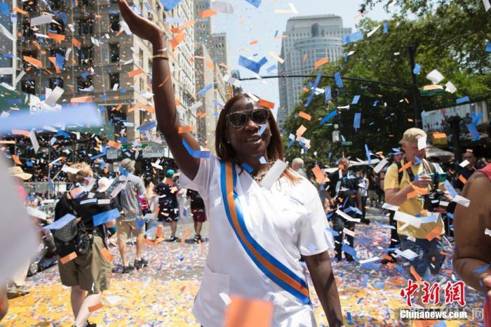 资料图:当地时间7月7日,“纸带游行”在美国纽约曼哈顿举行,致敬抗疫工作者。在活动现场,人们将办公室碎纸机中的纸带抛向游行队伍表达敬意。 中新社记者 廖攀 摄