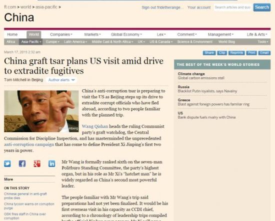 英媒:王岐山即将访美谈猎狐行动 国内新闻 • 2015-03-17 12:18• 收藏本文 k6n阿根廷华人网 英国《金融时报》报道截图 转载本网稿件,原则上需要书面授权,不得篡改稿件主题。本网随时有权要求第三方停止侵权行为。 本网所载内容或图片,若涉及侵权,请联系删除。 17 ___________ 2015/03 英媒:王岐山即将访美谈猎狐行动 英国《金融时报》报道截图王岐山 【观察者网李晽编译】680人,一半系自首,涉案金额过千万。经历5个多月,习近平、王岐山曾多次批示的猎狐行动在去年交上了一份令人满 [ 微信长按识别二维码或扫码查看分享内容 ]