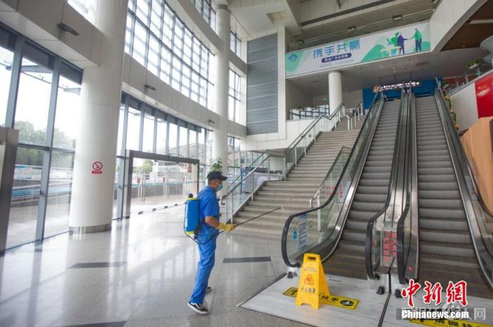 7月27日,南京汽车客运站内,工作人员正在消杀。 中新社记者 泱波 摄