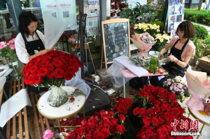 资料图:“七夕”将至,昆明市一花店的店员在制作“七夕”花束和花篮。中新社记者 刘冉阳 摄