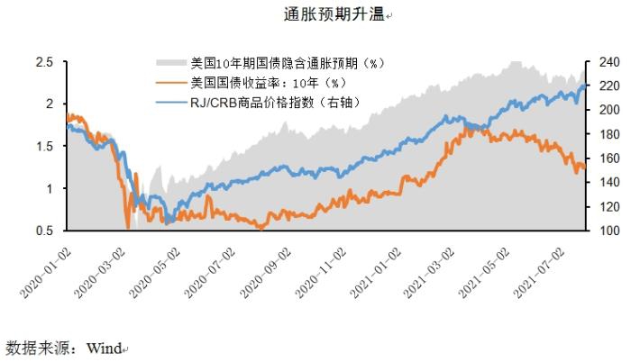 在此过程中,未来通胀水平的变化是决定未来政策走向的核心因素。大规模刺激政策下,货币宽松,随着经济重新开放,需求逐渐恢复,全球通胀预期已开始升温。从发达国家来看,美国10年期国债隐含通胀预期大幅上升,超过疫情前的水平,美国十年期国债收益率最高已突破1.7%,反映了市场对通胀预期的担忧,同时大宗商品价格指数也在上升通道。根据IMF预测,美国通胀将在2022年达到2.25左右。与此同时,新兴经济体通胀风险已经抬头,2020年7月份,土耳其通胀率高达18.95%,巴西和俄罗斯通胀率均超过6%。