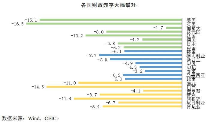 导致收入减少。财政赤字不断增加,推高本已在高位的政府债务,同时财政持续赤字又会增加债务不可持续的预期,导致全球各国财政空间急剧压缩。