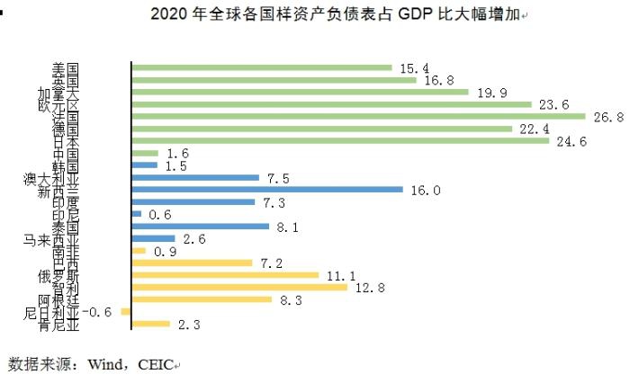 总体来看,全球各国采取了大规模的刺激政策以缓解疫情对经济和金融造成的冲击,发达国家在财政政策和货币政策支持力度上远高于新兴经济体。刺激政策的措施和受益对象因各国疫情发展、政策空间和社保体制等因素不同而有较大差别。在此过程中,发达经济体通过财政政策和货币政策协同合作,财政赤字货币化的同时央行职能边界有了新的突破,资产负债表信用风险上升。新兴经济体在发达国家低利率政策下,可以采取宽松政策避免通货膨胀,但其政策空间十分有限。尽管如此,财政政策和货币政策的刺激在全球范围产生了积极效果。