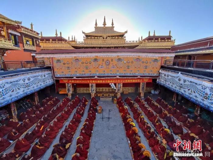 资料图:4月5日,西藏自治区2021年度藏传佛教学经僧人考核晋升格西拉让巴学位立宗答辩暨颁证仪式在大昭寺举行。中新社记者 江飞波 摄