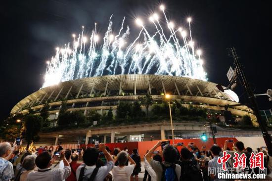 8月24日,2020东京残奥会开幕式在东京新国立竞技场举行。图为体育场上空烟花绽放。