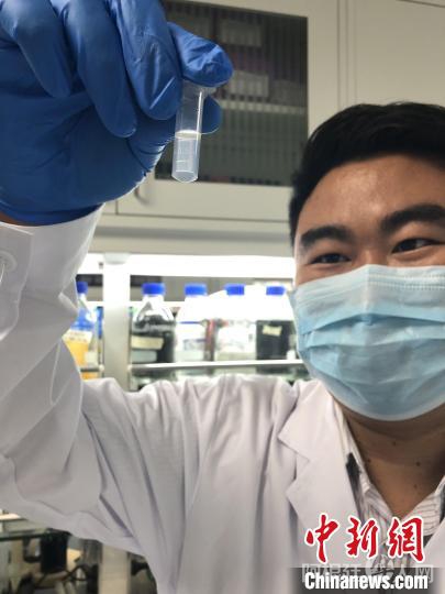 中科院天津工业生物技术研究所蔡韬副研究员在实验室展示人工合成淀粉样品。 中科院科技摄影联盟 供图