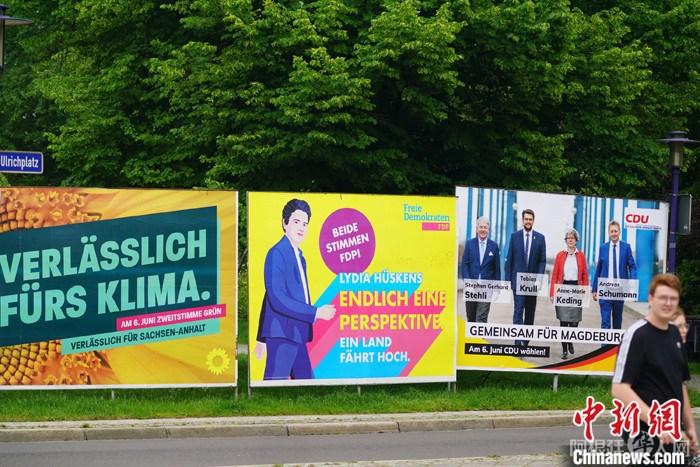当地时间6月6日,路人经过萨安州州府马格德堡街头的多个政党的竞选广告。 中新社记者 彭大伟 摄
