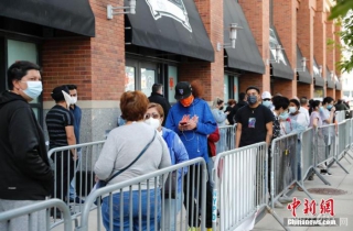 资料图:当地时间5月12日,美国纽约大都会棒球队主场花旗球场新冠疫苗接种点,民众排队接种疫苗。 中新社记者 廖攀 摄