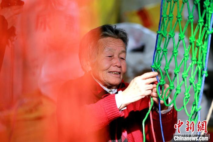 在该村曲张社区电商服务点,几位老人正熟练的拿着梭子编网,梭子灵活地穿梭在五彩的绳子之间。 梁犇 摄
