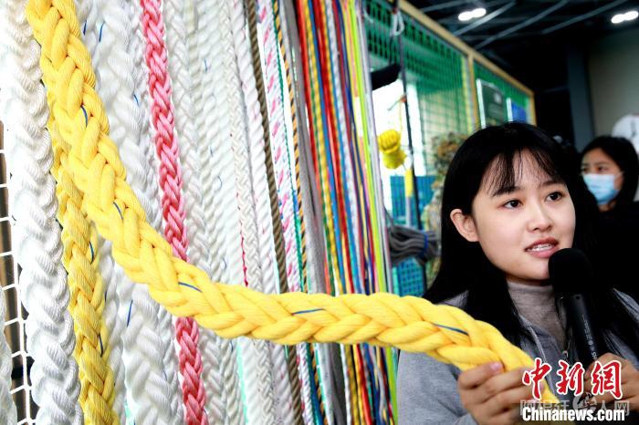 讲解员向记者介绍网绳产业相关产品。 梁犇 摄